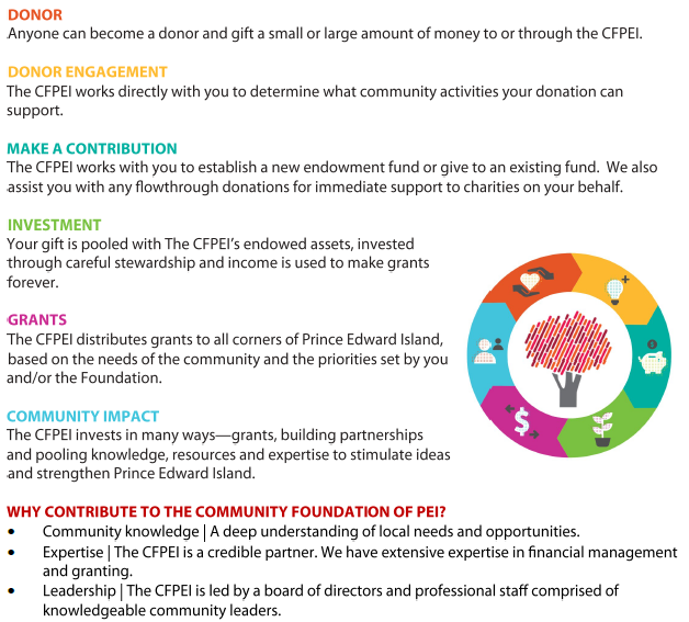 The Community Foundation of Prince Edward Island (CFPEI) is an incorporated, CRA Registered Charity that provides a ‘user-friendly’ vehicle for donors to create endowment, flowthrough, legacy and agency funds to support charitable activities. Income generated from these investments is directed through grants and scholarships to support a wide range of diverse needs in Prince Edward Island communities. Because of the permanent nature of endowments, income is available for now and generations to come.